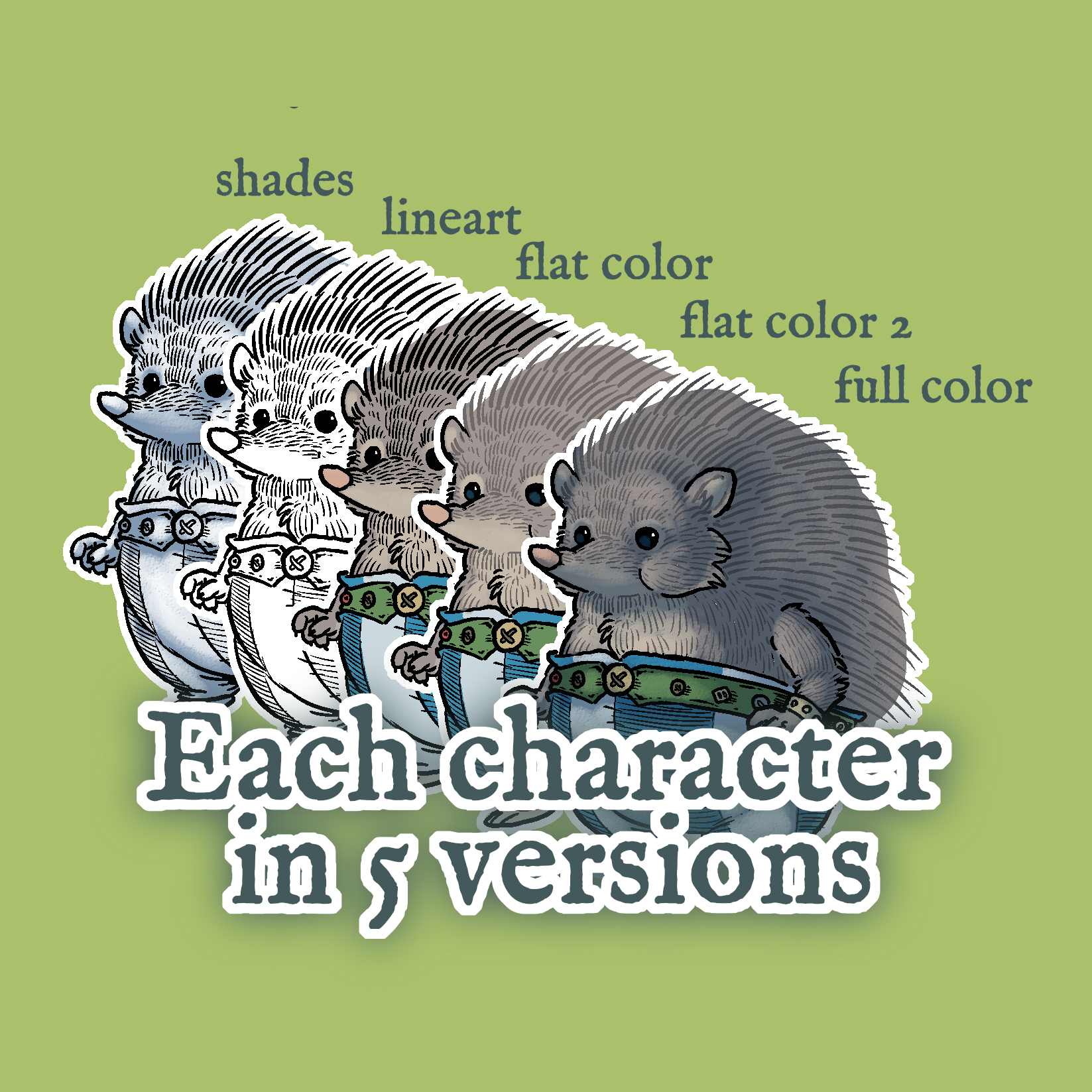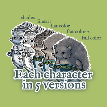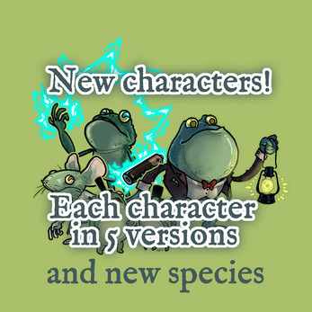 23 new characters - mice, frogs, squirrels and more! Each character comes with 5 versions. All in PDS files (I'll upload all 115 PNG files soon)
